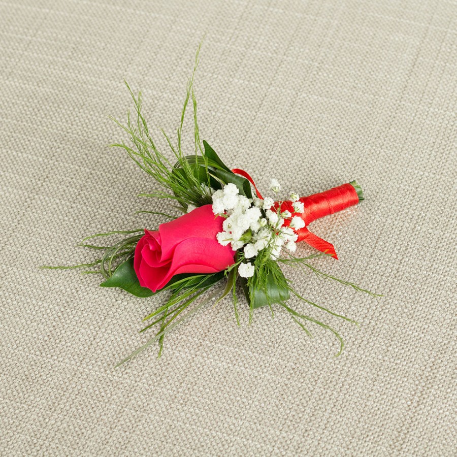 Enhance the groom's ensemble with our stunning buttonholes, meticulously crafted from vibrant red roses, delicate gypsophila, and lush aralia leaves. Each piece is finished with a charming satin red ribbon, adding a touch of sophistication to any wedding suit.