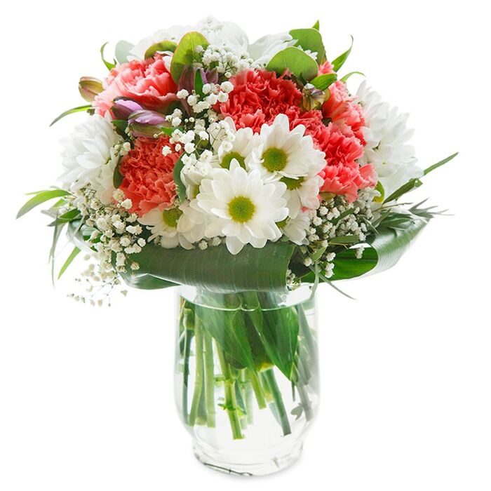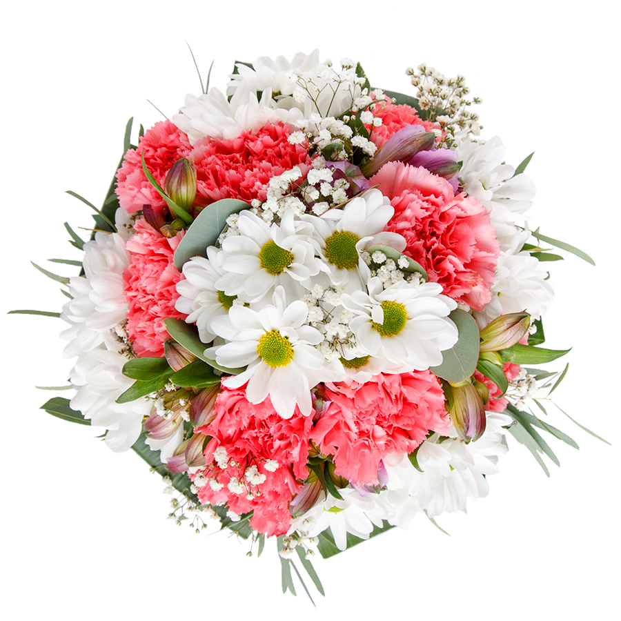 Our graceful bouquet is the epitome of elegance and charm. This unique arrangement features a stunning mix of snow-white chrysanthemums, airy gypsophila, and light pink carnations, all beautifully arranged with vibrant aspidistra leaves.
